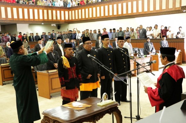 TRENDNEWS - Dewan Perwakilan Rakyat (DPR) Aceh melaksanakan pengukuhan empat Pimpinan Dewan melalui sidang paripurna, selasa (23/12). Sidang yang berlangsung di ruang sidang utama DPR Aceh itu dimulai Pukul 11.35 WIB dengan lancar hingga akhir kegiatan.