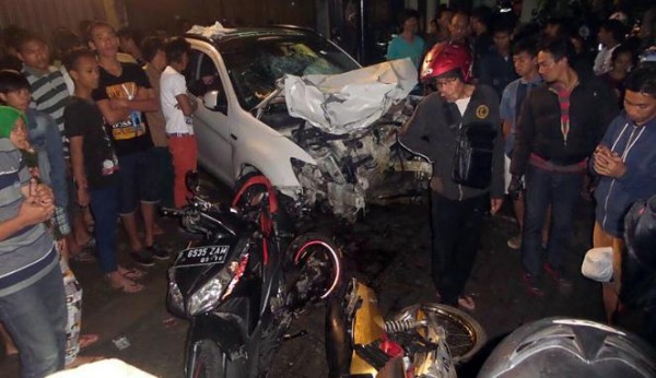 Mobil sport Mitsubishi Outlander berwarna putih bertabrakan dengan enam sepeda motor. Akibatnya, tiga pengendara dan penumpang sepeda motor tewas dalam kecelakaan itu.