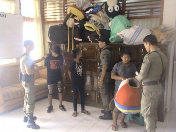TRENDNEWS.co.id - Badut-badut di kawasan Jam Gadang Bukit Tinggi memang kerap kali memaksa pengunjung untuk berfoto bersama. Hal ini membuat masyarakat merasa resah akibat ulah badut tersebut. Menindaklanjuti adanya laporan masyarakat tersebut Satuan Polisi Pamong Praja, Selasa (10/2/2015) menggelar penertiban, dan tiga orang operator beserta 18 kostum badut berhasil diamankan untuk mempertanggungjawabkan perbuatannya.