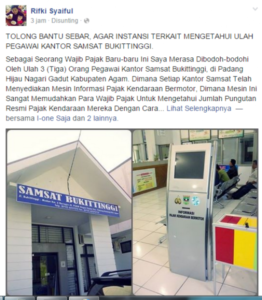 Rifki melampiaskan kekecewaanya di media social karena buruknya layanan publik di Kantor Samsat Bukittinggi.