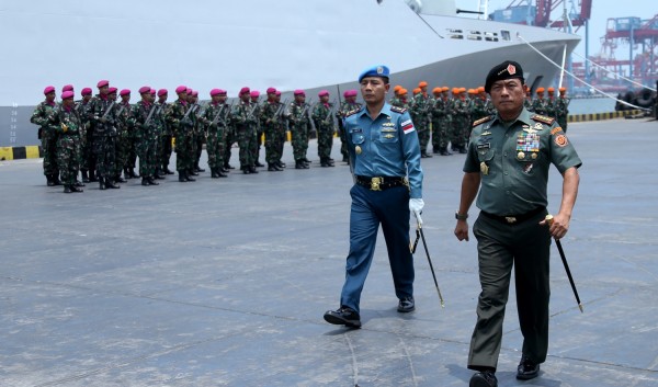 TRENDNEWS.co.id, Jakarta - Panglima TNI Jenderal Moeldoko melepas 800 prajurit TNI, yang tergabung dalam Satuan Tugas Batalyon Komposit (Satgas Yon Komposit) TNI Kontingen Garuda (Konga) XXXV-A/UNAMID (United Nations Mission In Darfur), di Mabes TNI Cilangkap, Jakarta Timur, Rabu (18/2/2015).